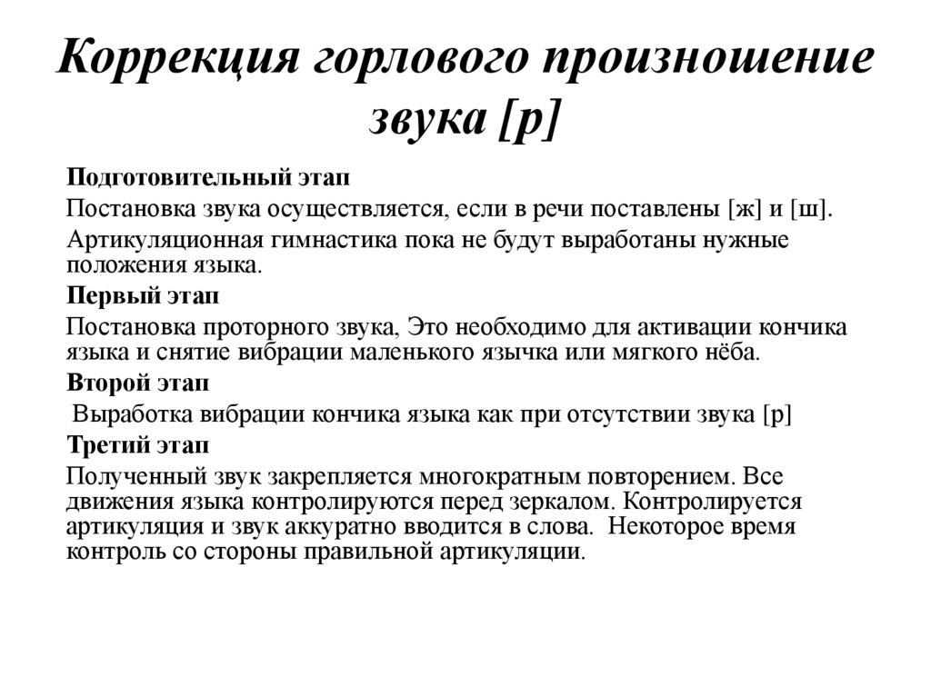 Избавиться от картавости помогают специальные упражнения. Они укрепляют мышцы языка и связки ротовой полости, мягкая буква «р» становится твердой. Чтобы устранить дефект, необходимо: