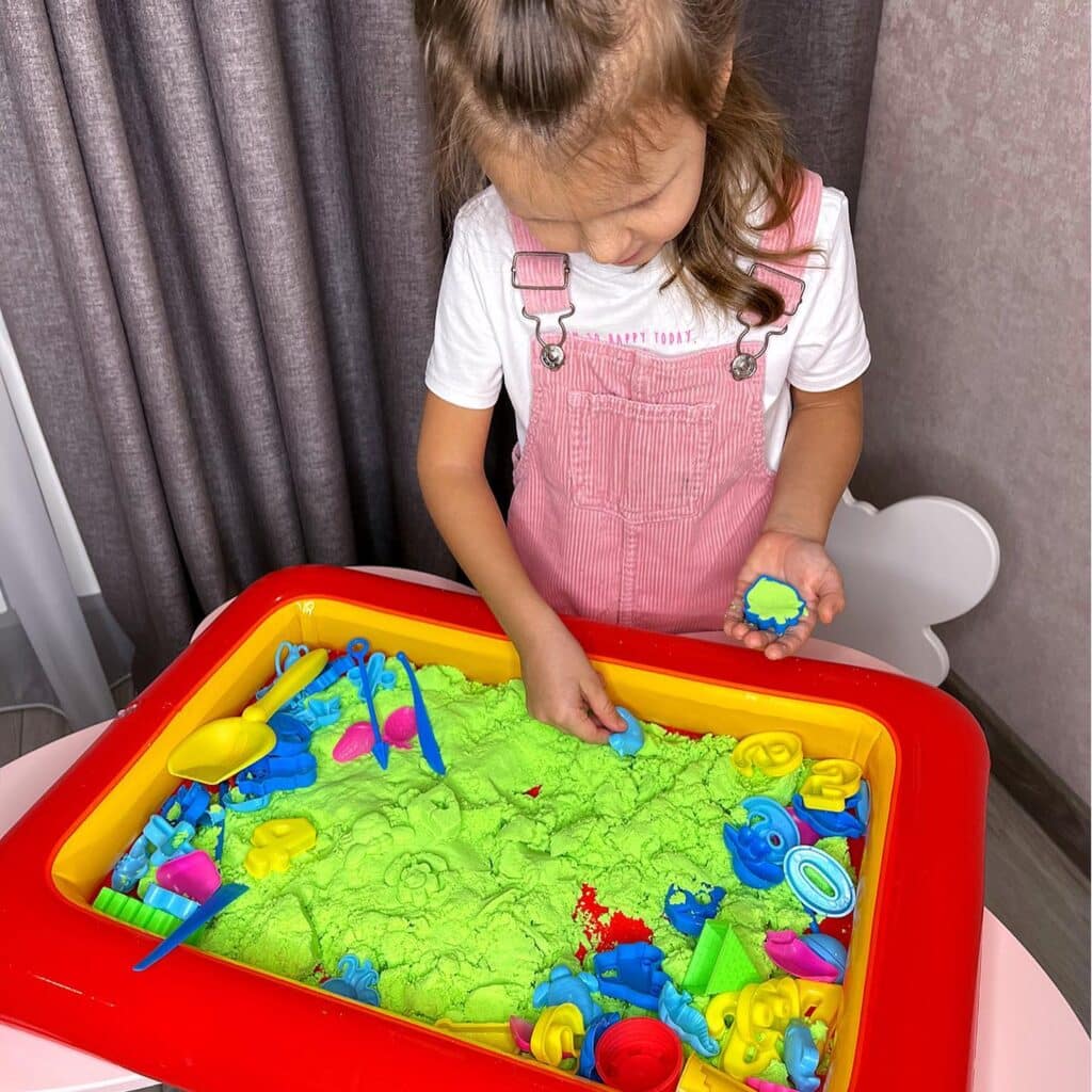 Игры с кинетическим песком дают ребенку незабываемые тактильные ощущения, развивают мелкую моторику, усидчивость, способствуют развитию творческих способностей. Проявив немного фантазии, можно придумать множество игр на развитие памяти, мышления, речи, воображения, а также, используя кинетический песок, можно обучать детей счету и письму. Благодаря играм с кинетическим песком можно не только способствовать развитию ребенка, но и гармонизации детско-родительских отношений. Большинство мам отмечают, что их дети с удовольствием играют с этим материалом. Кроме этого его достаточно просто хранить дома и легко убирать.
