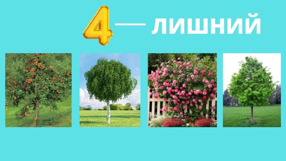 Игра учит классифицировать растения по ключевым признакам. Для занятия сделайте карточки, на каждой из которых должны быть изображены 4 вида деревьев, из них один принадлежит другой категории.