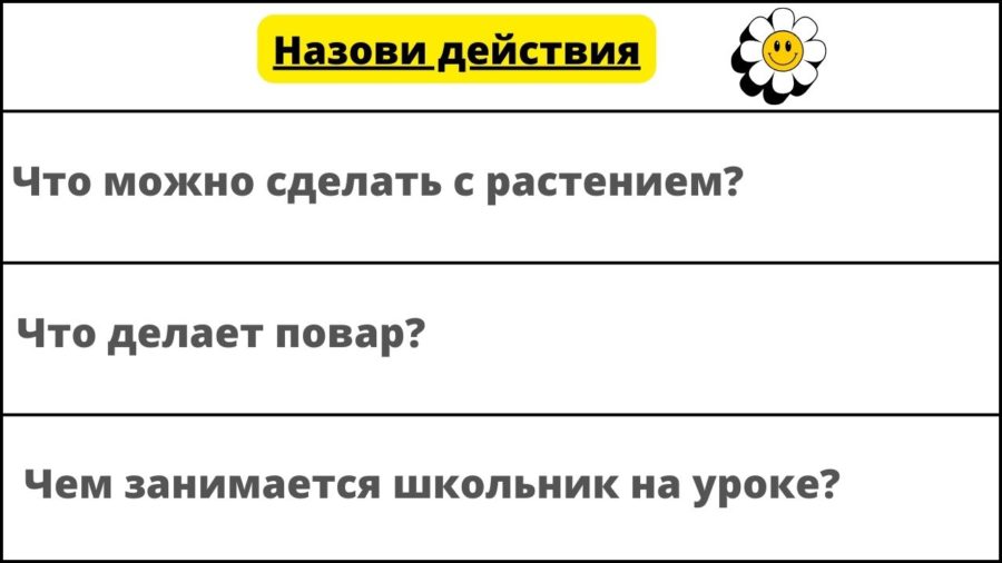 Игра учит подбору глаголов по смыслу фразы. Воспитатель спрашивает, что можно сделать с определенным объектом или что он сам может делать, дети перечисляют возможные действия. За каждый правильный ответ игрок получает фишку. Побеждает ребенок, у которого в конце игры оказалось наибольшее количество фишек.