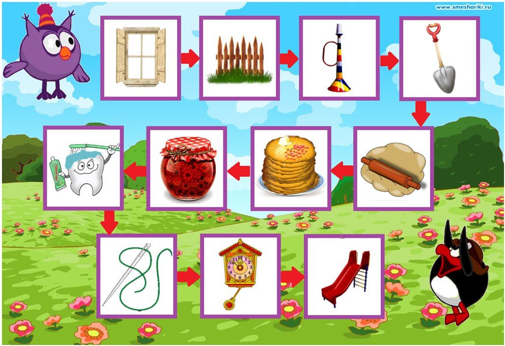 Нужно заранее подобрать картинку любимого мультипликационного героя, девочки, котика, кого угодно. Вырезаем заготовки в виде конфет, а на них наклеивай изображение предметов, в названии которых есть проблемная буква. Говорим ребенку, что наш герой очень любит сладости и нужно его покормить