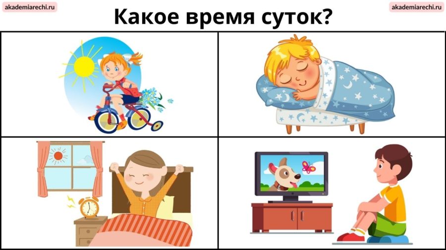 Педагог раздает по одной карточке каждому ребенку. Затем произносит слово «утро». Карточки над головой поднимают дети, у которых сюжет картинки происходит утром. Далее воспитатель произносит слово «день», «вечер», «ночь». Ребята поднимают соответствующие карточки. В ходе игры педагог может спрашивать выбранных наугад игроков, почему они подняли свою карточку. Дети должны отвечать развернутыми фразами.