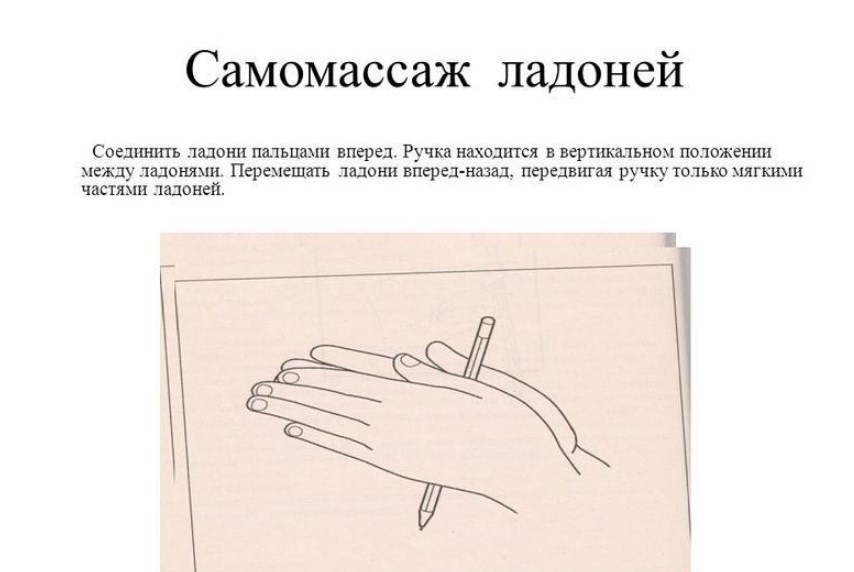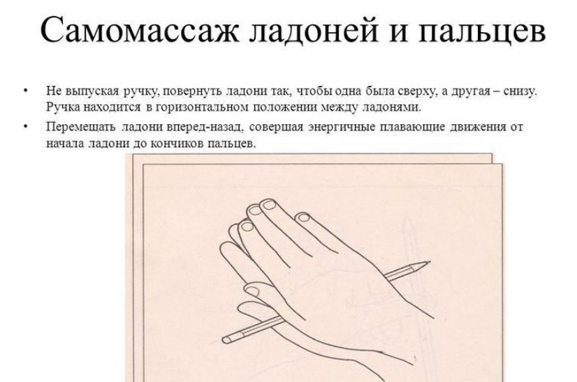 Ладошки соединяют как в предыдущем примере, но так, что бы правая рука (или левая, если ребенок левша) была сверху. Карандаш нужно разместить горизонтально и перемещать взад-вперед с помощью только верхней ладошки.