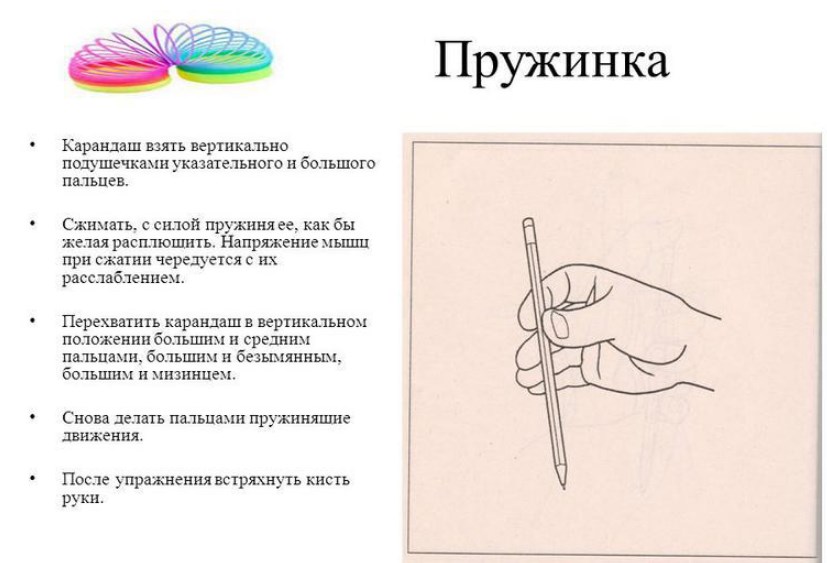 Ручку, которая лежит на столе, нужно по очереди поднимать с помощью разных комбинаций пальцев. Вначале большим и указательным, затем большим и средним, а после – большим и безымянным