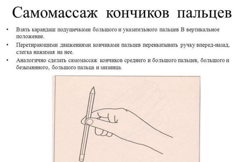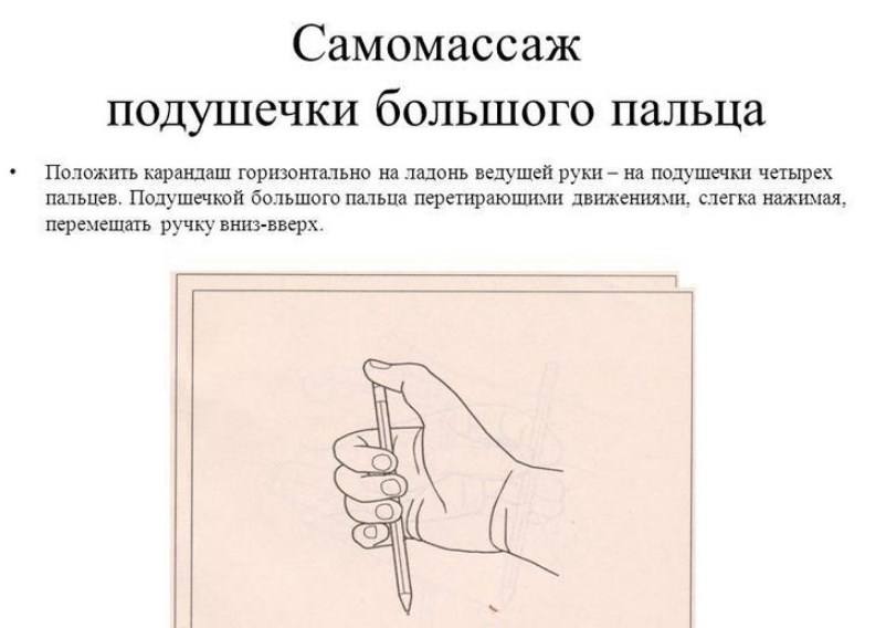 - Самомассаж подушечек пальцев. На подушечки пальцев нужно положить ручку так, что бы большой палец придерживал ее и был противопоставлен остальным четырем. С помощью большого пальца нужно перемещать ручку, слегка нажимая.