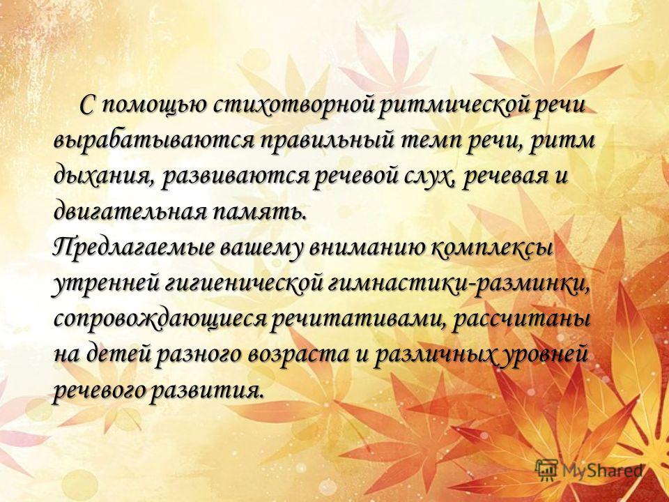 С помощью стихотворной ритмической речи вырабатываются правильный темп речи, ритм дыхания, развиваются речевой слух, речевая и двигательная память. Предлагаемые вашему вниманию комплексы утренней гигиенической гимнастики-разминки, сопровождающиеся речитативами, рассчитаны на детей разного возраста и различных уровней речевого развития. С помощью стихотворной ритмической речи вырабатываются правильный темп речи, ритм дыхания, развиваются речевой слух, речевая и двигательная память. Предлагаемые вашему вниманию комплексы утренней гигиенической гимнастики-разминки, сопровождающиеся речитативами, рассчитаны на детей разного возраста и различных уровней речевого развития.