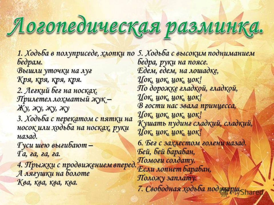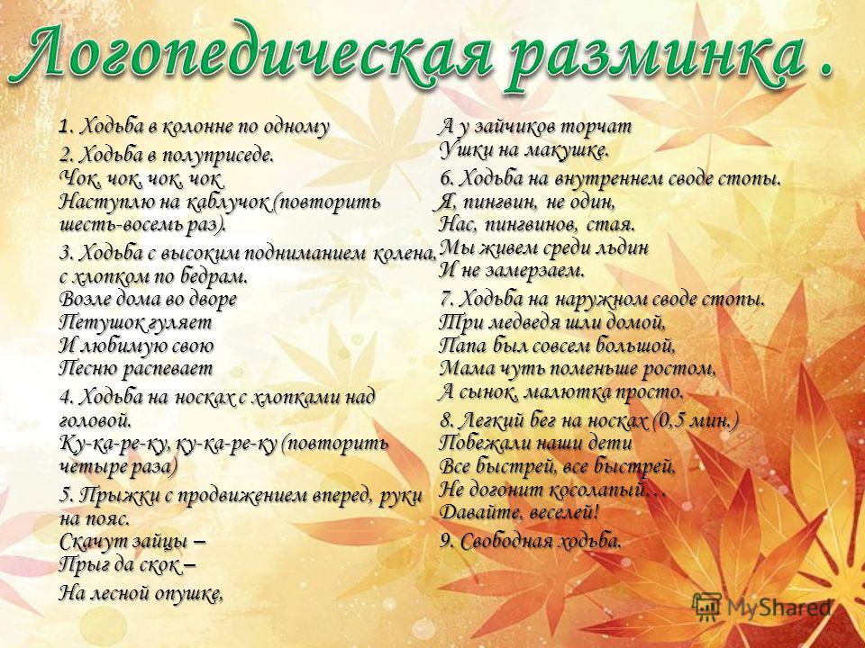1. Ходьба в колонне по одному 2. Ходьба в полуприседе. Чок, чок, чок, чок Наступлю на каблучок (повторить шесть-восемь раз). 3. Ходьба с высоким подниманием колена, с хлопком по бедрам. Возле дома во дворе Петушок гуляет И любимую свою Песню распевает 4. Ходьба на носках с хлопками над головой. Ку-ка-ре-ку, ку-ка-ре-ку (повторить четыре раза) 5. Прыжки с продвижением вперед, руки на пояс. Скачут зайцы – Прыг да скок – На лесной опушке, А у зайчиков торчат Ушки на макушке. 6. Ходьба на внутреннем своде стопы. Я, пингвин, не один, Нас, пингвинов, стая. Мы живем среди льдин И не замерзаем. 7. Ходьба на наружном своде стопы. Три медведя шли домой, Папа был совсем большой, Мама чуть поменьше ростом, А сынок, малютка просто. 8. Легкий бег на носках (0,5 мин.) Побежали наши дети Все быстрей, все быстрей, Не догонит косолапый… Давайте, веселей! 9. Свободная ходьба.