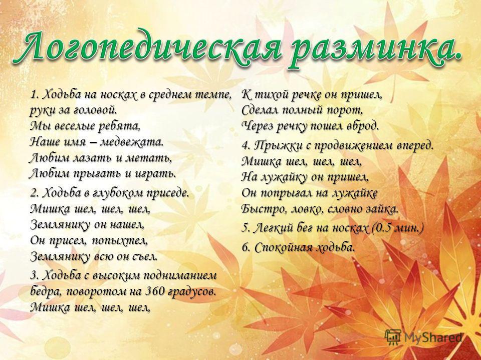 1. Ходьба на носках в среднем темпе, руки за головой. Мы веселые ребята, Наше имя – медвежата. Любим лазать и метать, Любим прыгать и играть. 2. Ходьба в глубоком приседе. Мишка шел, шел, шел, Землянику он нашел, Он присел, попыхтел, Землянику всю он съел. 3. Ходьба с высоким подниманием бедра, поворотом на 360 градусов. Мишка шел, шел, шел, К тихой речке он пришел, Сделал полный порот, Через речку пошел вброд. 4. Прыжки с продвижением вперед. Мишка шел, шел, шел, На лужайку он пришел, Он попрыгал на лужайке Быстро, ловко, словно зайка. 5. Легкий бег на носках (0.5 мин.) 6. Спокойная ходьба.