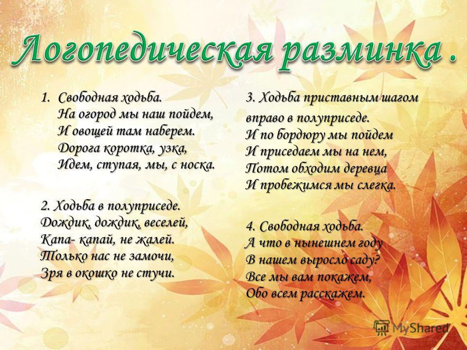 1.Свободная ходьба. На огород мы наш пойдем, И овощей там наберем. Дорога коротка, узка, Идем, ступая, мы, с носка. 2. Ходьба в полуприседе. Дождик, дождик, веселей, Капа- капай, не жалей. Только нас не замочи, Зря в окошко не стучи. 3. Ходьба приставным шагом вправо в полуприседе. И по бордюру мы пойдем И приседаем мы на нем, Потом обходим деревца И пробежимся мы слегка. 4. Свободная ходьба. А что в нынешнем году В нашем выросло саду? Все мы вам покажем, Обо всем расскажем.