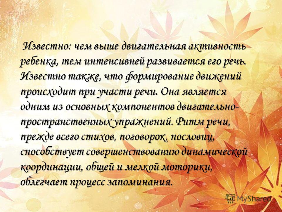 Известно: чем выше двигательная активность ребенка, тем интенсивней развивается его речь. Известно также, что формирование движений происходит при участи речи. Она является одним из основных компонентов двигательно- пространственных упражнений. Ритм речи, прежде всего стихов, поговорок, пословиц, способствует совершенствованию динамической координации, общей и мелкой моторики, облегчает процесс запоминания.