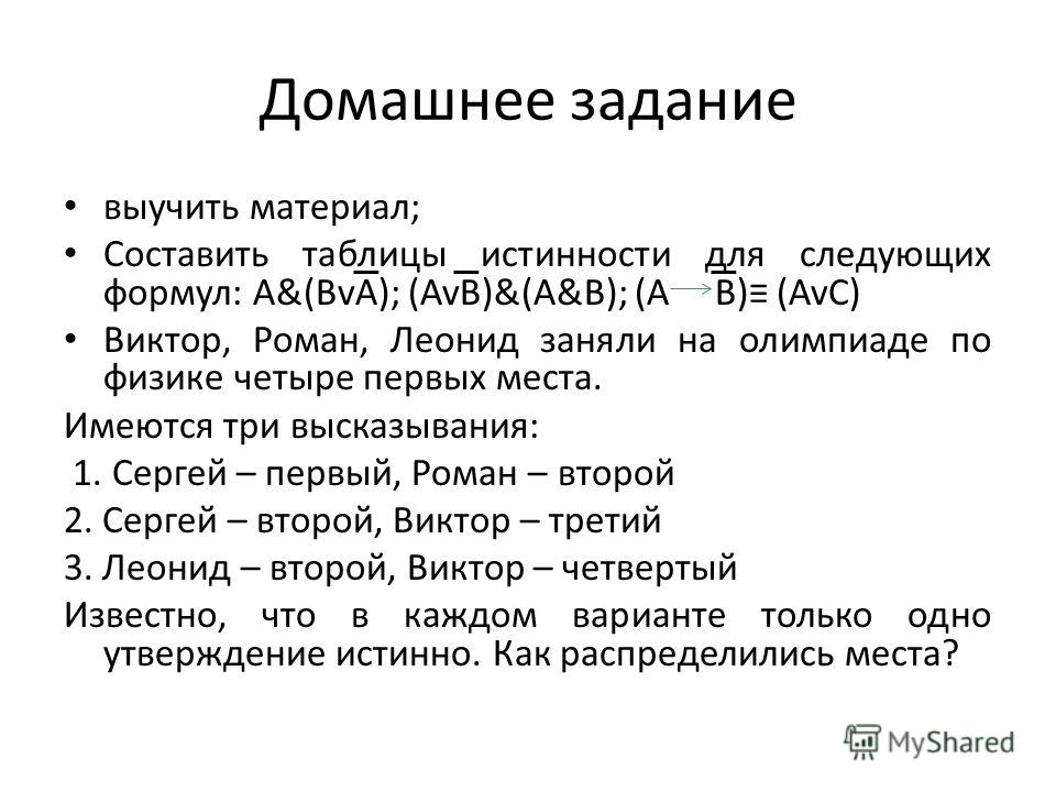 Домашнее задание выучить материал; Составить таблицы истинности для следующих формул: A&(BvA); (AvB)&(A&B); (A B) (AvC) Виктор, Роман, Леонид заняли на олимпиаде по физике четыре первых места. Имеются три высказывания: 1. Сергей – первый, Роман – второй 2. Сергей – второй, Виктор – третий 3. Леонид – второй, Виктор – четвертый Известно, что в каждом варианте только одно утверждение истинно. Как распределились места?