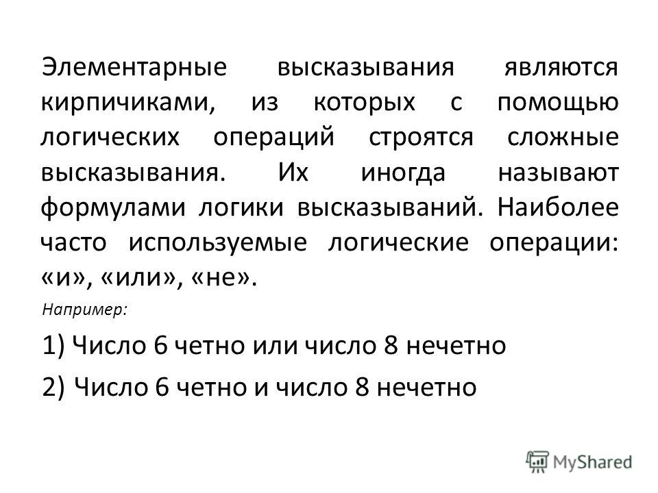 Элементарные высказывания являются кирпичиками, из которых с помощью логических операций строятся сложные высказывания. Их иногда называют формулами логики высказываний. Наиболее часто используемые логические операции: «и», «или», «не». Например: 1) Число 6 четно или число 8 нечетно 2) Число 6 четно и число 8 нечетно