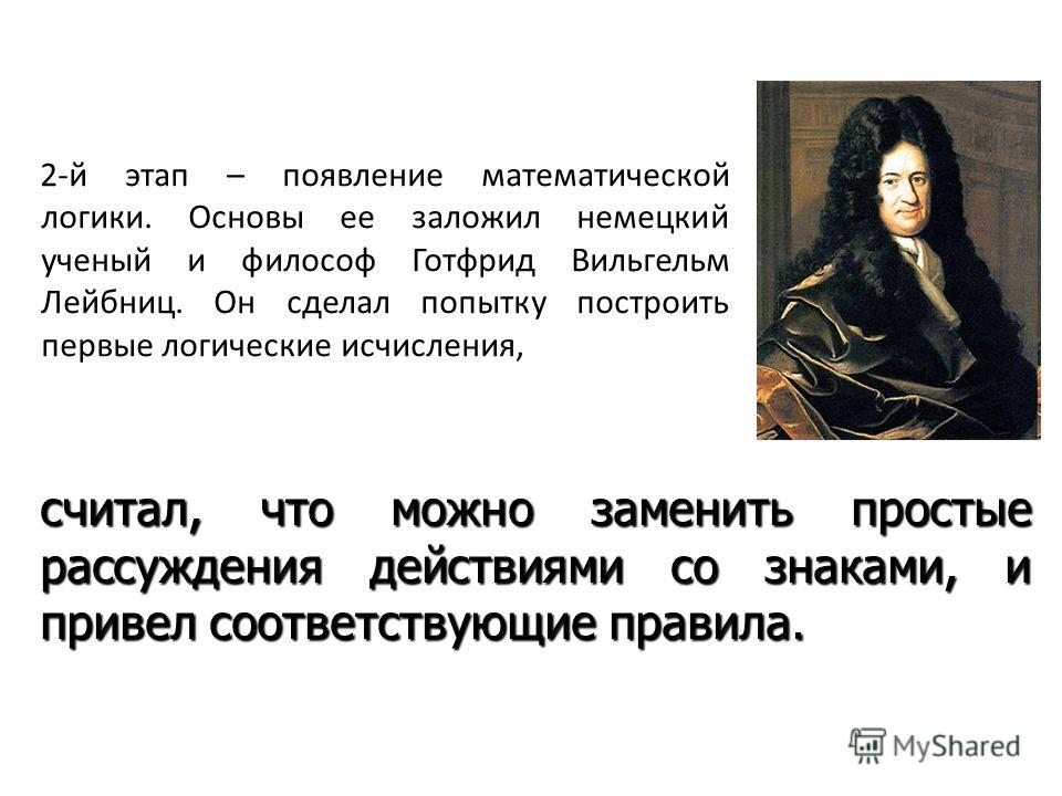 2-й этап – появление математической логики. Основы ее заложил немецкий ученый и философ Готфрид Вильгельм Лейбниц. Он сделал попытку построить первые логические исчисления, считал, что можно заменить простые рассуждения действиями со знаками, и привел соответствующие правила.