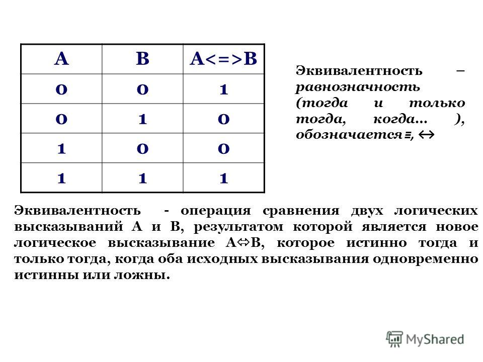 АВА B Эквивалентность — операция сравнения двух логических высказываний А и В, результатом которой является новое логическое высказывание А В, которое истинно тогда и только тогда, когда оба исходных высказывания одновременно истинны или ложны. Эквивалентность – равнозначность (тогда и только тогда, когда… ), обозначается,