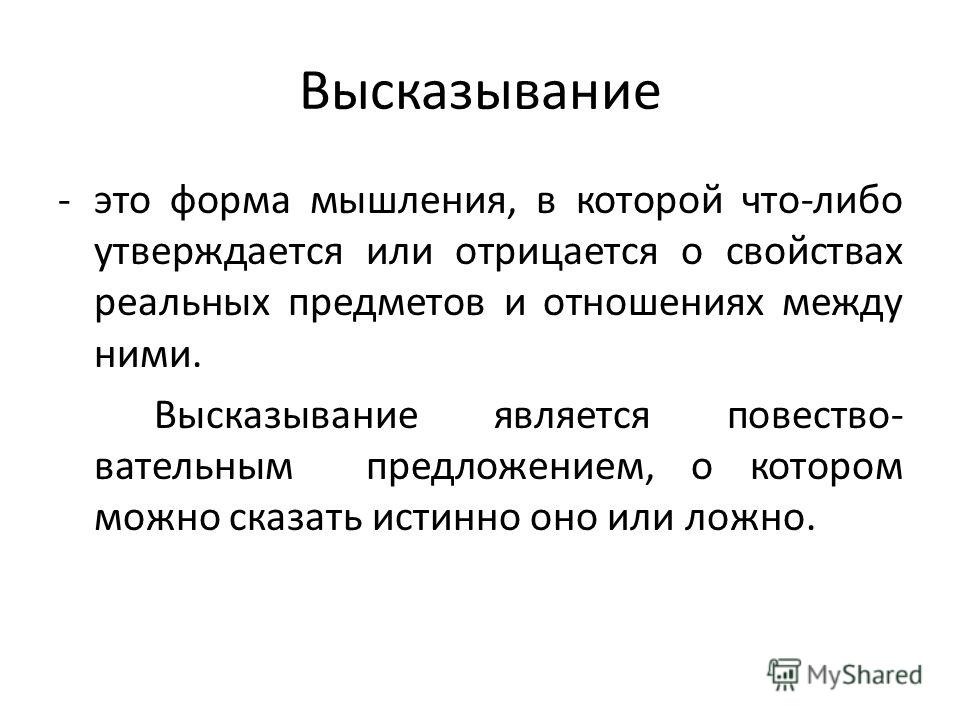 Высказывание -это форма мышления, в которой что-либо утверждается или отрицается о свойствах реальных предметов и отношениях между ними. Высказывание является повество- вательным предложением, о котором можно сказать истинно оно или ложно.