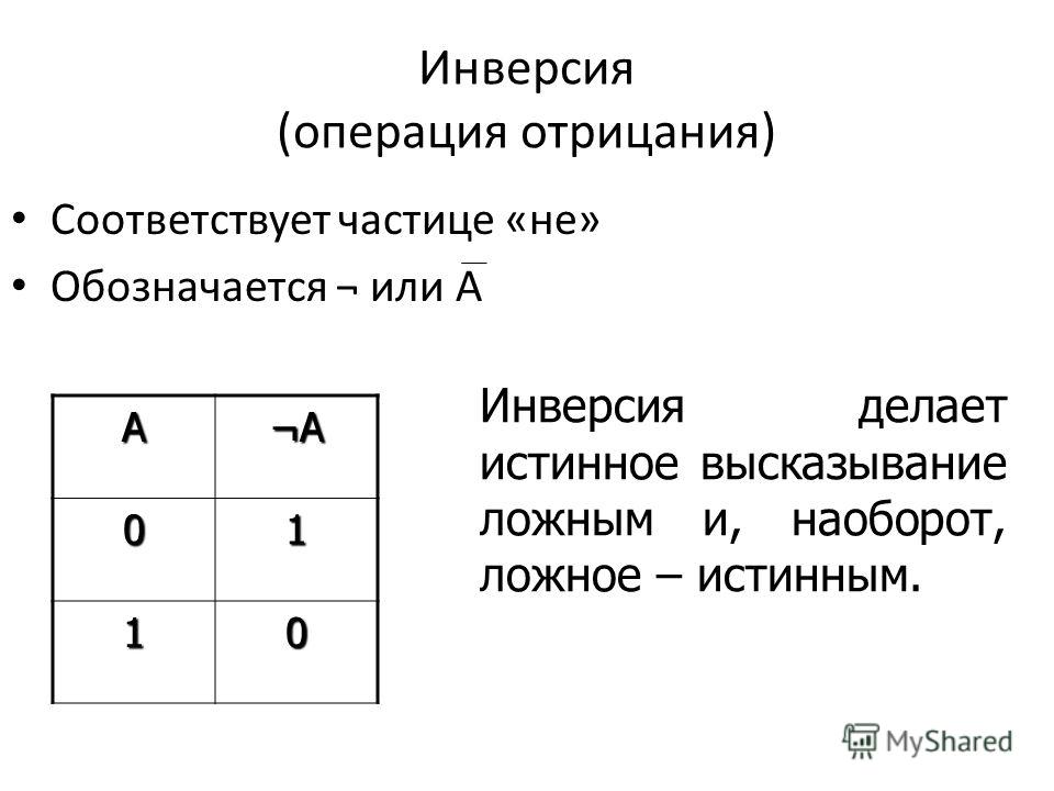 Инверсия (операция отрицания) А ¬А¬А¬А¬А Соответствует частице «не» Обозначается ¬ или А Инверсия делает истинное высказывание ложным и, наоборот, ложное – истинным.