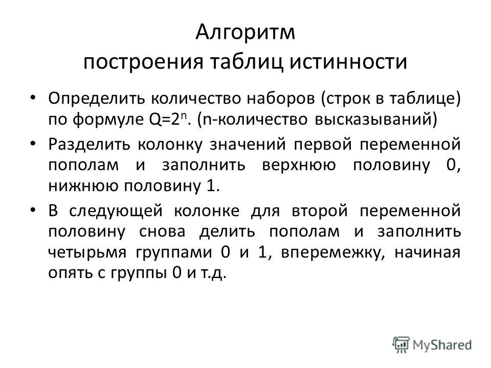 Алгоритм построения таблиц истинности Определить количество наборов (строк в таблице) по формуле Q=2 n. (n-количество высказываний) Разделить колонку значений первой переменной пополам и заполнить верхнюю половину 0, нижнюю половину 1. В следующей колонке для второй переменной половину снова делить пополам и заполнить четырьмя группами 0 и 1, вперемежку, начиная опять с группы 0 и т.д.