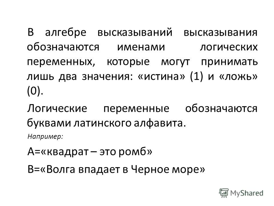 В алгебре высказываний высказывания обозначаются именами логических переменных, которые могут принимать лишь два значения: «истина» (1) и «ложь» (0). Логические переменные обозначаются буквами латинского алфавита. Например: А=«квадрат – это ромб» В=«Волга впадает в Черное море»