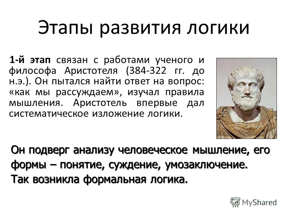 Этапы развития логики 1-й этап связан с работами ученого и философа Аристотеля ( гг. до н.э.). Он пытался найти ответ на вопрос: «как мы рассуждаем», изучал правила мышления. Аристотель впервые дал систематическое изложение логики. Он подверг анализу человеческое мышление, его формы – понятие, суждение, умозаключение. Так возникла формальная логика.