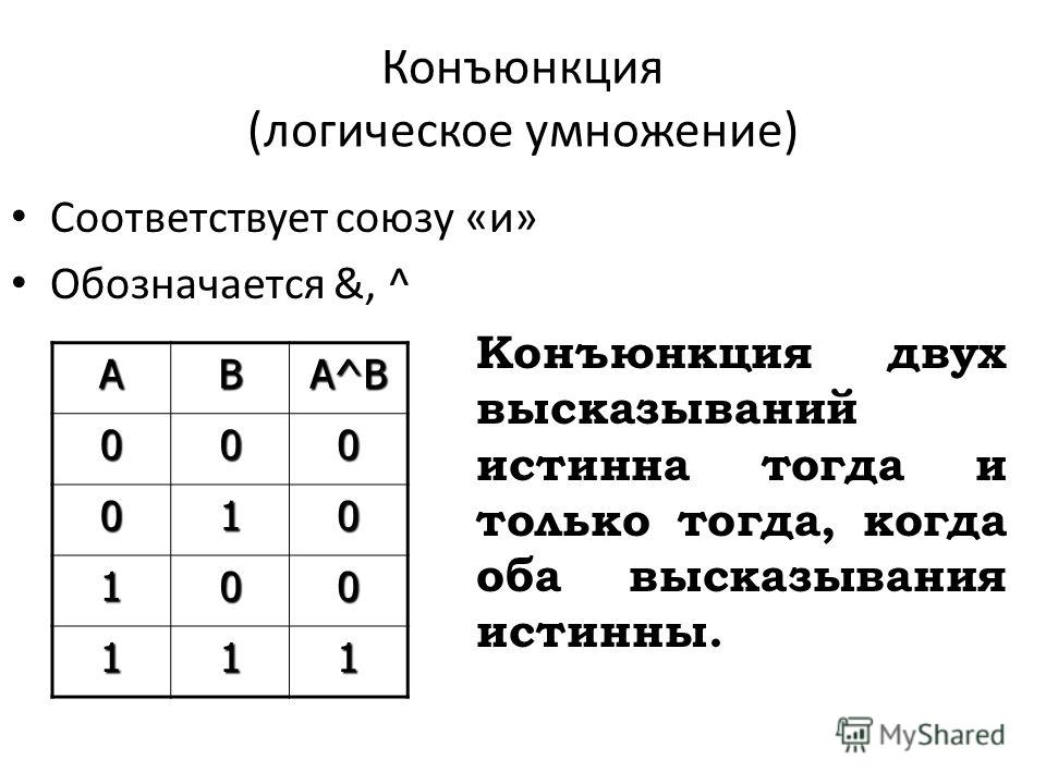 Конъюнкция (логическое умножение) АВ А^ВА^ВА^ВА^В Соответствует союзу «и» Обозначается &, ^ Конъюнкция двух высказываний истинна тогда и только тогда, когда оба высказывания истинны.