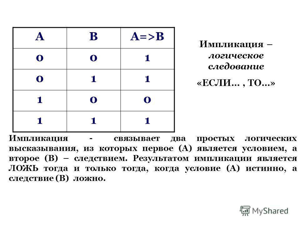 АВА=>B Импликация — связывает два простых логических высказывания, из которых первое (А) является условием, а второе (В) – следствием. Результатом импликации является ЛОЖЬ тогда и только тогда, когда условие (А) истинно, а следствие (В) ложно. Импликация – логическое следование «ЕСЛИ…, ТО…»