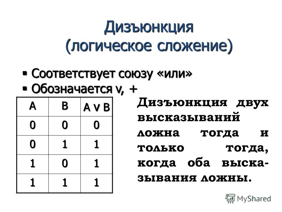 Дизъюнкция (логическое сложение) Соответствует союзу «или» Соответствует союзу «или» Обозначается v, + Обозначается v, + АВ А v В Дизъюнкция двух высказываний ложна тогда и только тогда, когда оба выска- зывания ложны.