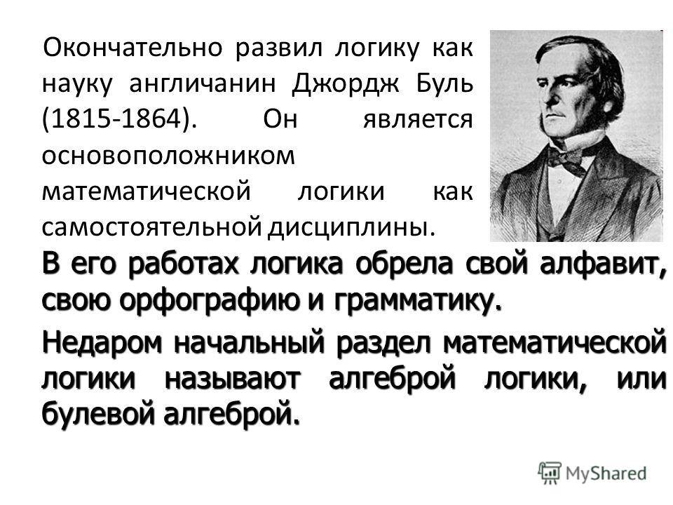 Окончательно развил логику как науку англичанин Джордж Буль ( ). Он является основоположником математической логики как самостоятельной дисциплины. В его работах логика обрела свой алфавит, свою орфографию и грамматику. Недаром начальный раздел математической логики называют алгеброй логики, или булевой алгеброй.